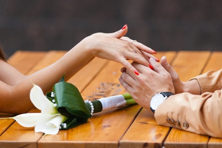 wedding couple holding hands, happy groom and bride