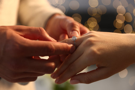 Making marriage proposal. Man putting engagement ring on his girlfriend's finger against blurred background, closeup. Bokeh effect