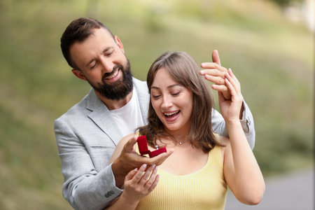 man wearing ring on finger of happy girlfriend outdoors