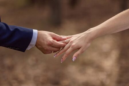 Man and woman hold hands close up. Hands of man and woman close up.