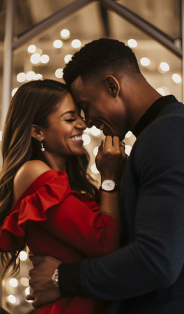 Affectionate black couple hugging and looking at each other, middle aged man holding box with engagement ring