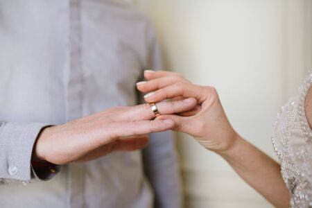The bridegroom puts the wedding ring on the bride close up.