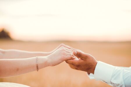 Close-up of a loving couple holding hands on the background of the setting sun