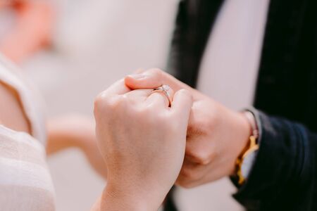 Pleasant moment of engagement. Cropped image of man putting on engagement ring on his wife finger while standing outdoors. Marriage proposal concept. Man and woman engaged. Romance of couple in love.