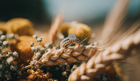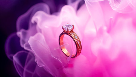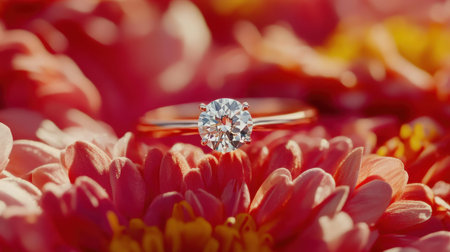 A stunning diamond ring showcased against a backdrop of colorful flowers, perfect for highlighting love, romance, and elegance in wedding themes.