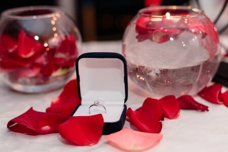 A diamond engagement ring with a romantic proposal setting, surrounded by rose petals and soft, ambient light.