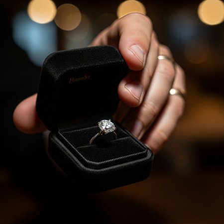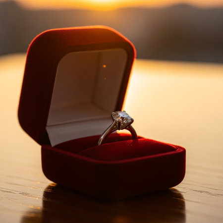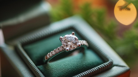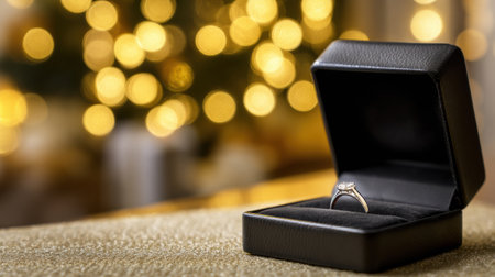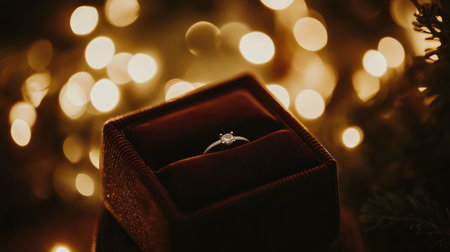 Engagement ring in a dark velvet box, placed against a soft, blurred background of warm lights, highlighting romance
