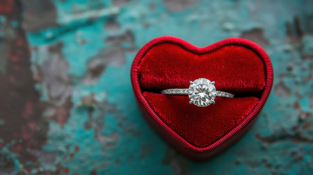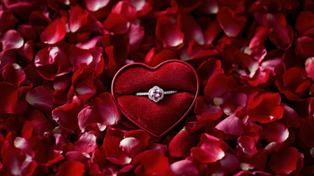 A stunning engagement ring nestled in a heart-shaped velvet box surrounded by vibrant red rose petals, creating a romantic and elegant atmosphere for special moments.