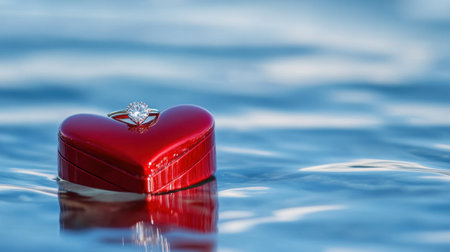 A vibrant red heart-shaped box floats gently on a serene water surface, showcasing a beautiful engagement ring, symbolizing love and romance.