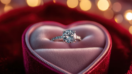 A stunning diamond ring displayed elegantly in a heart-shaped box, set against a soft, blurred bokeh background, perfect for romantic themes.
