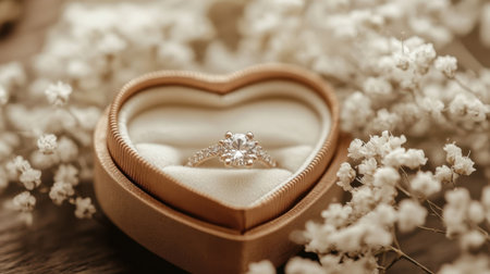 A stunning diamond ring sits in a heart-shaped box adorned with soft material, surrounded by delicate white flowers, creating a romantic atmosphere.