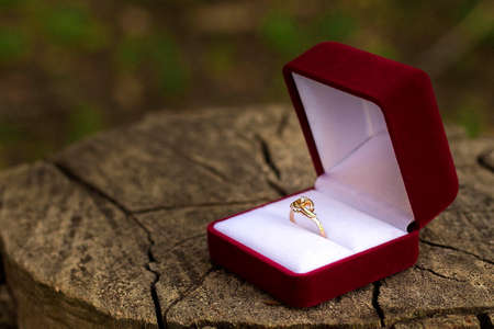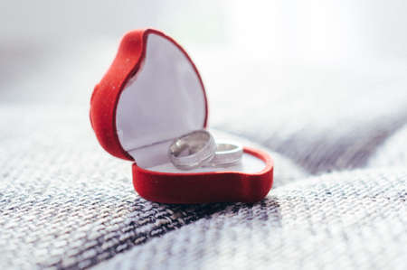 Gold ring, wedding ring in red box and, red heart on white-red background with beautiful bokeh. The moment of a wedding, anniversary, engagement, or Valentine's Day. Happy day
