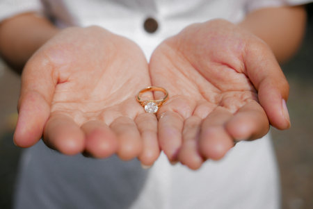 This image presents hands clasped together, with a ring prominently displayed on one finger. The composition highlights textures and tones. The lighting is soft. Potential applications include visual elements for relationship-themed content or concepts representing commitment. Suitable for various editorial and commercial projects.