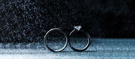 Two wedding rings in infinity sign with sparkling light mist. Love concept on black background. Wide panoramic horizontal view