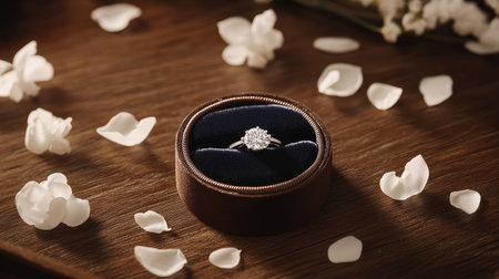 An exquisite diamond ring in a velvet box, staged on a wooden table with scattered white petals, romantic and timeless