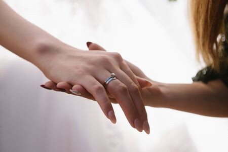 Hands of the bride and groom with rings. Wedding ceremony of man and woman. Creation of a family. Jewelry on the finger. Copy space.