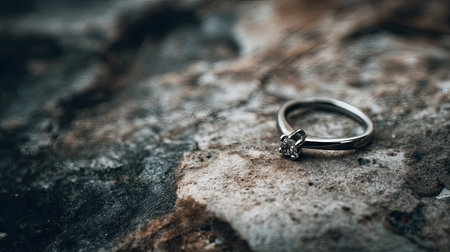 A close-up view of an elegant diamond ring resting on a textured stone surface. The soft light enhances the ring's clarity and sparkle, creating a romantic atmosphere.