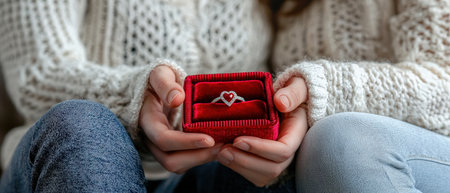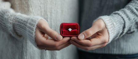 Close-up of a Valentine couple holding a red velvet box with an engagement ring inside