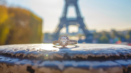 Engagement ring, on a beautiful little table, background of the Eiffel Tower, Paris generative ai