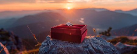 An engagement ring featuring a heart-shaped diamond set in a luxurious velvet box. The romantic proposal setting includes a mountain overlook at sunrise, with a picnic setup and a breathtaking view of the landscape.