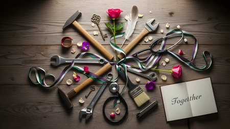 This beautiful still-life captures elegant wedding rings resting atop a row of pristine white roses, set against a rustic wooden backdrop, symbolizing love.