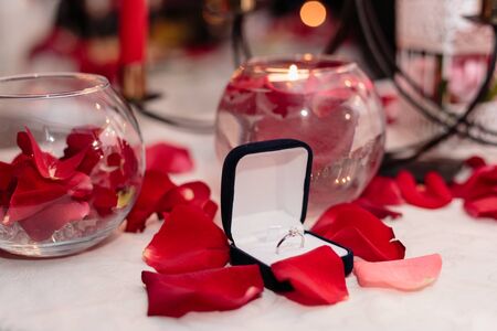 A red box with a ring, marriage proposal, Valentines Day, wine, romantic atmosphere