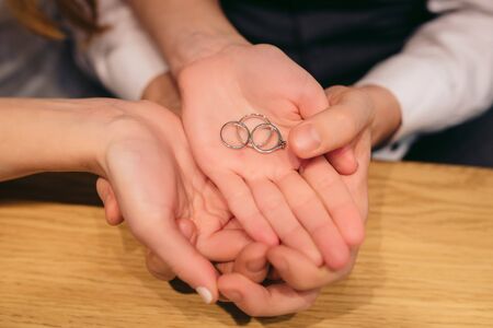 Man and woman couple of newlyweds hold hands with rings in a cafe with a cup of coffee. The bride and groom are in love