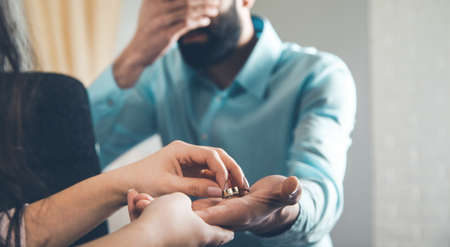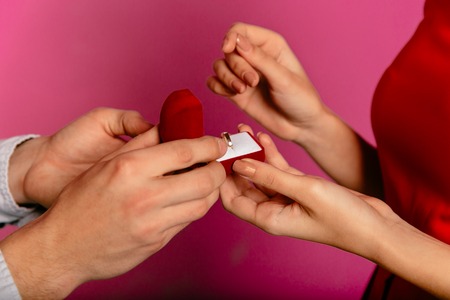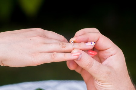 Close up of man putting beautiful engagement ring on his girlfriend hand. Man is making marriage proposal with golden ring with diamond to his woman. Close up hands of indian guy giving an engagement ring: do you want to marry me?