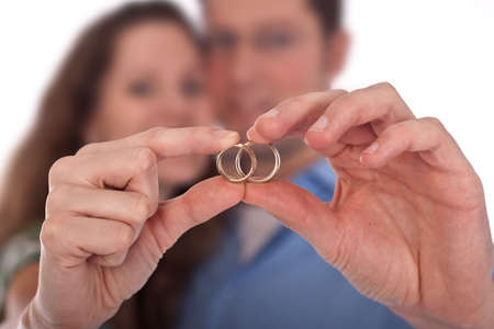 Young happy couple holding a diamond engagement ring. Shallow depth of field with sharp focus on the ring.