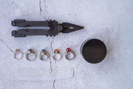 Stylish men's rings, pen, tools, hankerchief, pomade and perfume for grooming. Metrosexual ccessories on concrete background. Urban composition. Top view.