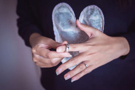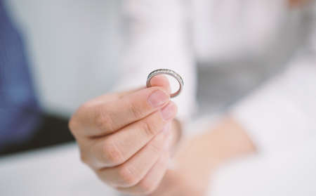 Hands gently holding a sparkling diamond engagement ring. Wedding concept. Closeup silver Wedding Diamond ring on the palms of the bride.
