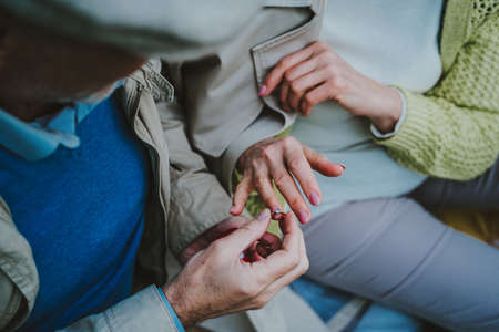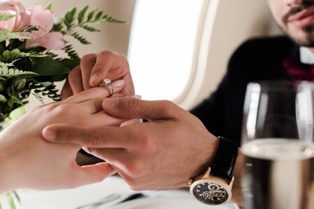 cropped view of man putting wedding ring on finger on woman while making marriage proposal in plane