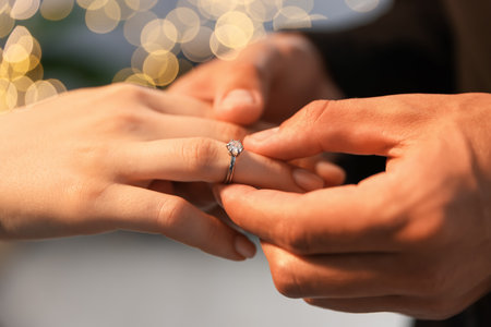 Making proposal. Man putting engagement ring on his girlfriend's finger indoors, closeup. Bokeh effect