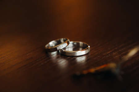 Old wedding rings on red background, The gift for valentine day, selective focus