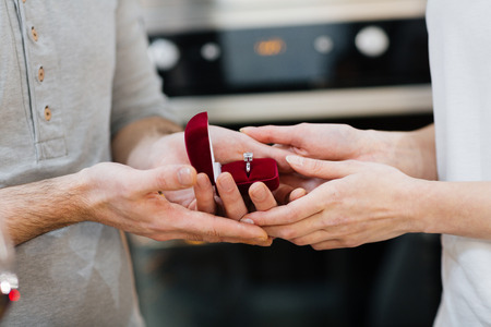 Cropped image of man putting on an engagement ring on his girlfriend's finger while they sitting at the tablet in a restaurant