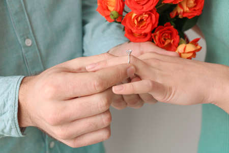 Young man putting ring on finger of his fiancee after marriage proposal, closeup