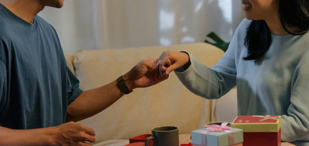 Happy young couple share love at home, woman and man celebrating romantic valentine day with joyful fist bump, exchanging beautifully wrapped gifts, enjoying cozy intimate moment indoors.