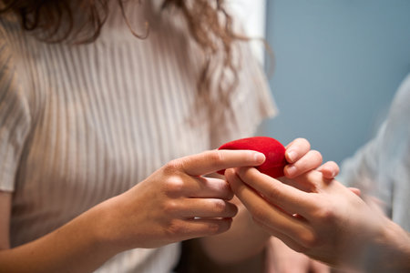 Close-up of a Valentine couple holding a red velvet box with an engagement ring inside