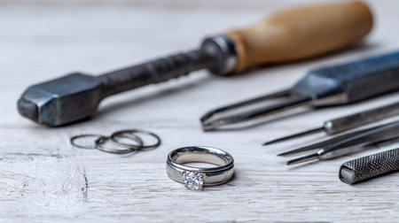 Jewelry craftsmanship. Handmade. Jeweler at work. The jeweller engraver tools on wooden vintage desk. Tweezers, Magnifier, Chisel Hand Engraving Top view Copy free space