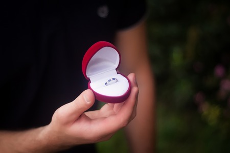 man holding engagement ring in box for proposal. Engagement ring box close up