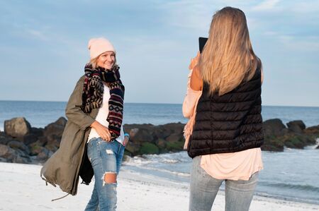 Portrait of two young friends spending some nice time together, walking on coast line and having fun.