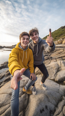 Portrait of two young friends spending good time together and taking a selfie with smartphone outdoors against the sea.