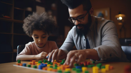 Back to School and Hands-On Learning. A father and son work together on educational materials, enhancing learning experiences.