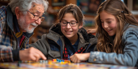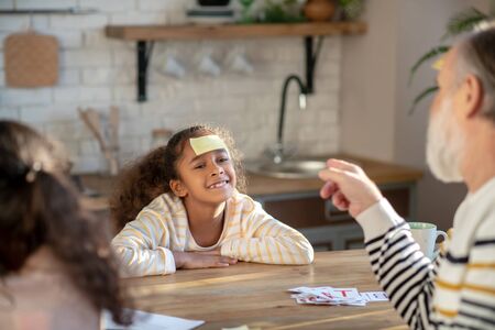 Happy people. Two girls and their granddad playing guess game and loking happy