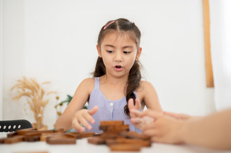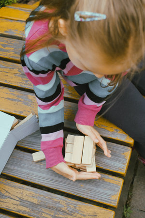 Cute little girl playing board game, building a tower from wooden blocks.