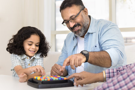 Happy adorable Indian little kid girl and mature grandpa playing smart learning board game at home. Positive grandfather entertaining grandkid with colorful puzzle balls on family weekend