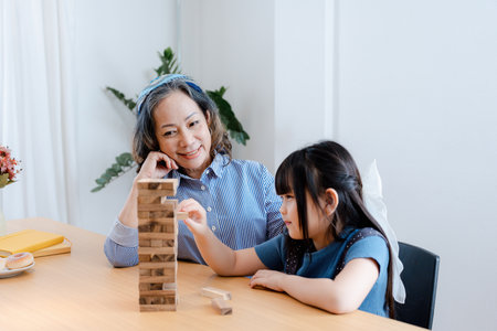 Asian portrait, grandchild granddaughter grandma grandmother and granddaughter happily join in activities to Block wood game Puzzle and enhance skills for grandchildren.
