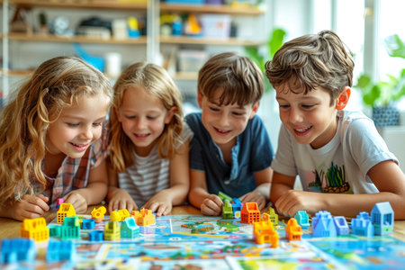 Happy cute children playing board games and having fun together at home