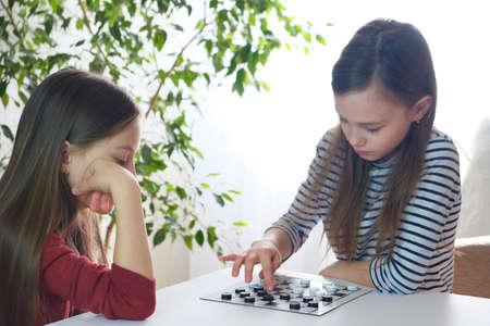 Children play checkers. Board games at home