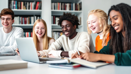 Multiracial university students sitting together at table with books and laptop, Happy young people doing group study in high school library, Life style concept with guys and girls in college campus.